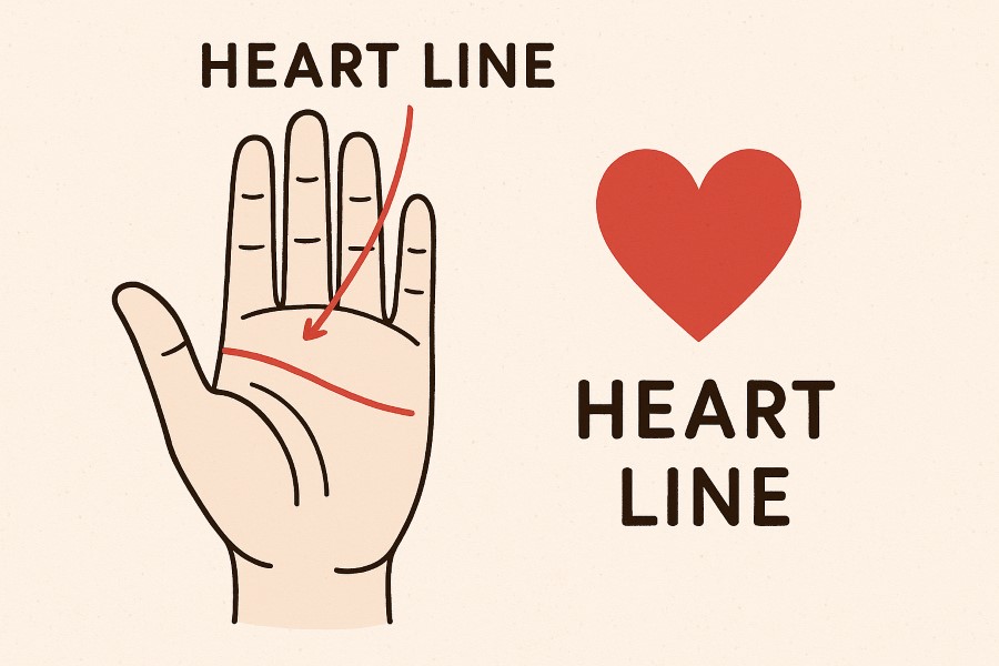 ស្ថិតនៅផ្ដេកផ្នែកខាងលើនៃបាតដៃ ត្រឹមក្រោមម្រាមដៃ ខ្សែបេះដូងបង្ហាញពីរបៀបដែលអ្នកស្រឡាញ់ មានអារម្មណ៍ និងកសាងទំនាក់ទំនង។ ខ្សែដែលច្បាស់ និងរលូន ជាញឹកញាប់ជារបស់បុគ្គលដែលមានមនោសញ្ចេតនាជ្រាលជ្រៅ ចិត្តមេត្តា និងសមត្ថភាពក្នុងការរក្សាទំនាក់ទំនងយូរអង្វែង។ ផ្ទុយទៅវិញ ខ្សែដែលដាច់ ឬមានខ្នែងច្រើន អាចបង្ហាញពីការលំបាកផ្នែកអារម្មណ៍ ជម្លោះផ្ទៃក្នុង ឬបញ្ហាប្រឈមក្នុងរឿងស្នេហា។
